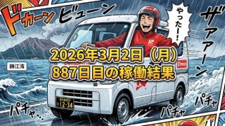 こんにちは!50歳で会社倒産・自己破産おじさんのステゴーです。2026年3月2日(月)887日目、鹿児島ウーバー配達員の稼働結果です。稼働時間11時間13分ウーバー34件17,008円出前館 1件 455円PickGo 0件合計...