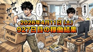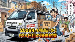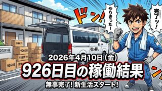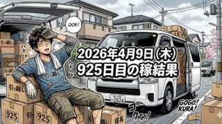 こんにちは!50歳で会社倒産・自己破産おじさんのステゴーです。2026年4月10日(金)926日目、ウーバー配達員の稼働結果です。稼働時間0時間0分ウーバー0件出前館0件PickGo0件合計0件福岡市に引っ越し完了。新しい借家での荷物の荷解...