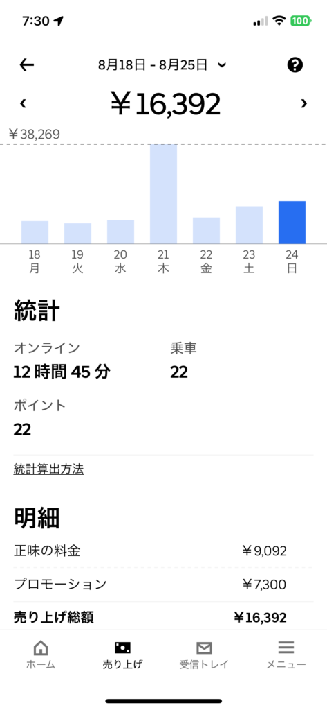 2025年8月24日(日) 697日目、鹿児島ウーバー配達員の稼働結果