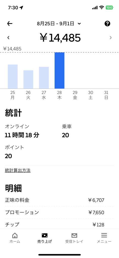 2025年8月28日(木) 701日目、鹿児島ウーバー配達員の稼働結果
