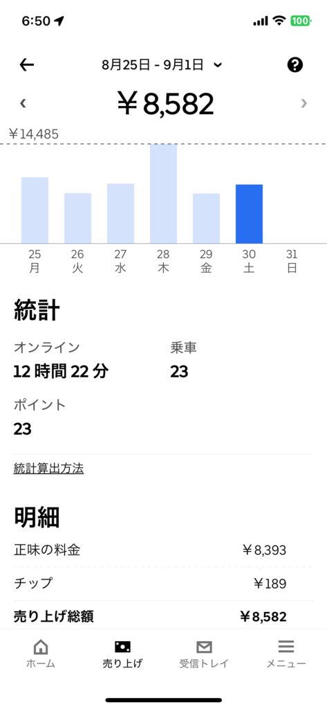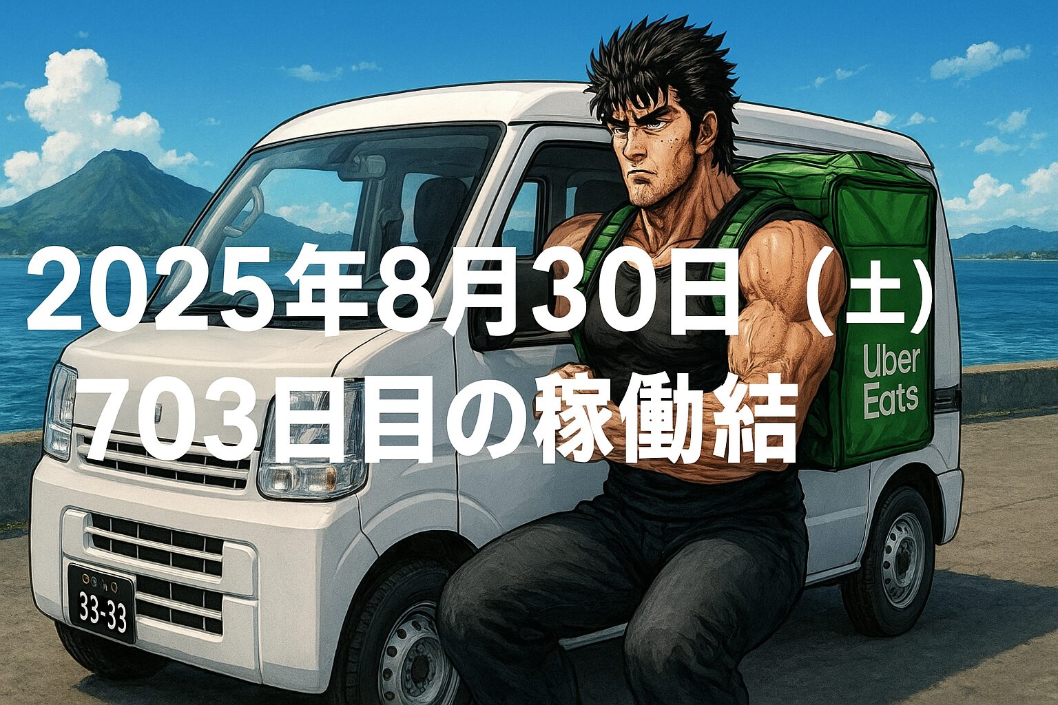 2025年8月30日(土) 703日目、鹿児島ウーバー配達員の稼働結果です。