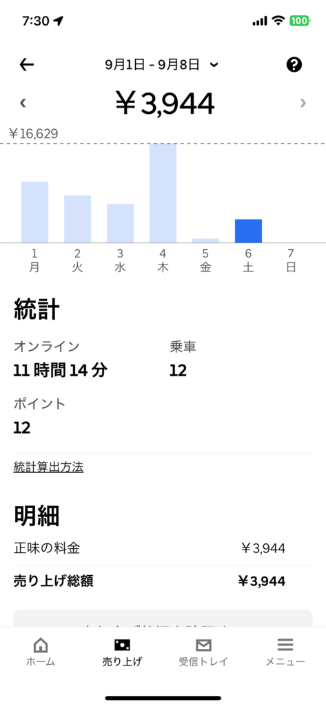 2025年9月6日(土) 710日目、鹿児島ウーバー配達員の稼働結果