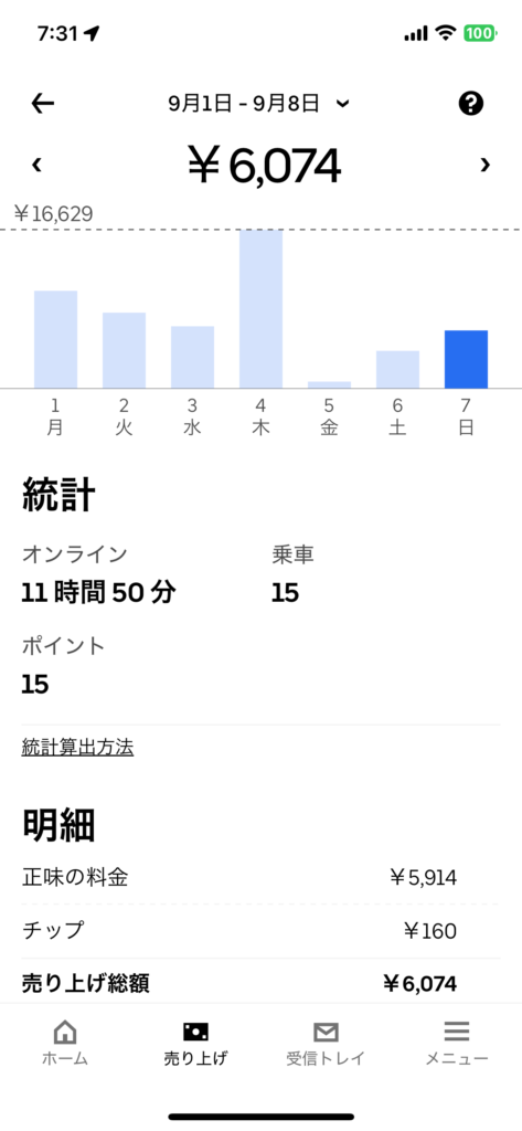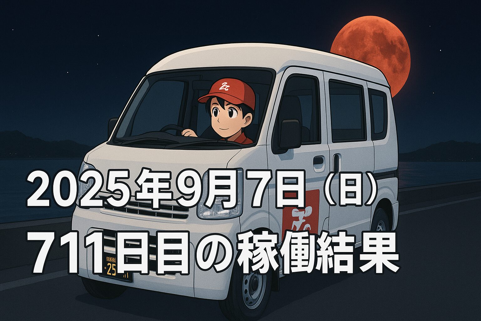 2025年9月7日(日) 711日目、鹿児島ウーバー配達員の稼働結果です。