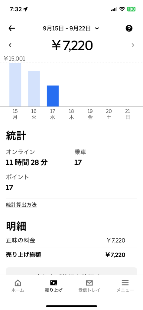 2025年9月17日(水) 721日目、鹿児島ウーバー配達員の稼働結果です。