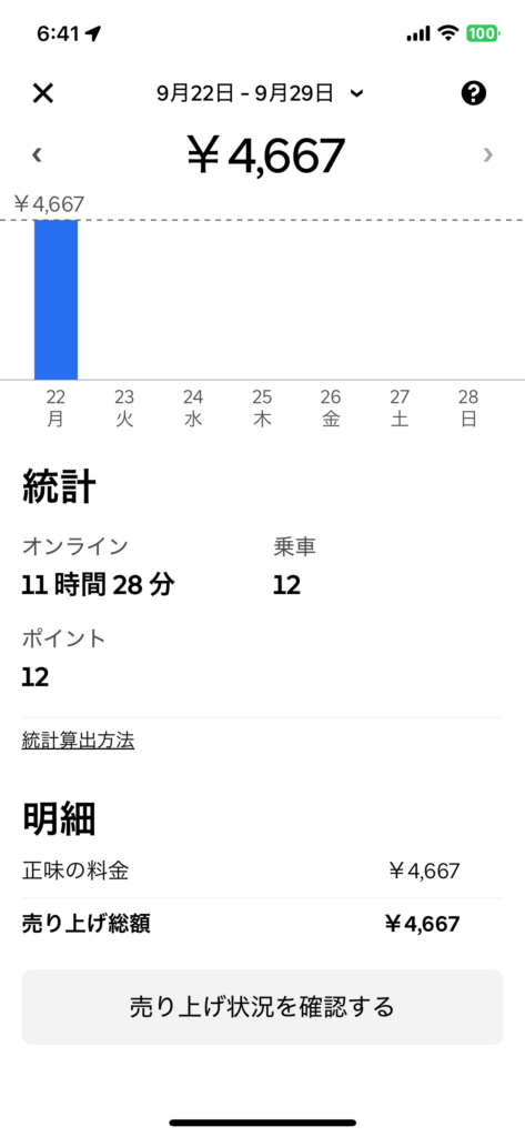 2025年9月22日(月) 726日目、鹿児島ウーバー配達員の稼働結果です。