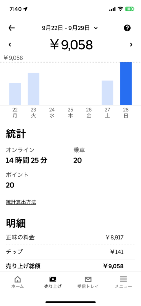 2025年9月28日(日) 732日目、鹿児島ウーバー配達員の稼働結果です。