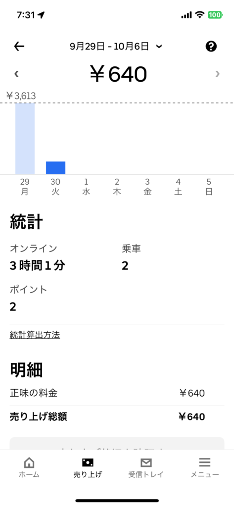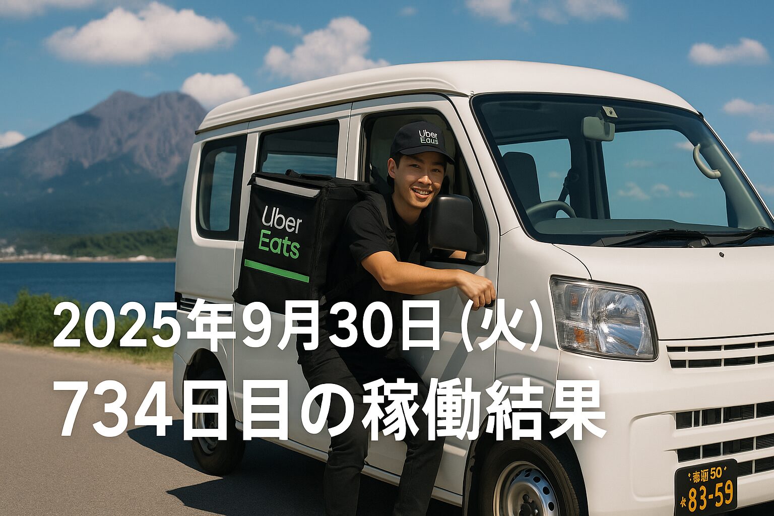 2025年9月30日(火) 734日目、鹿児島ウーバー配達員の稼働結果です。