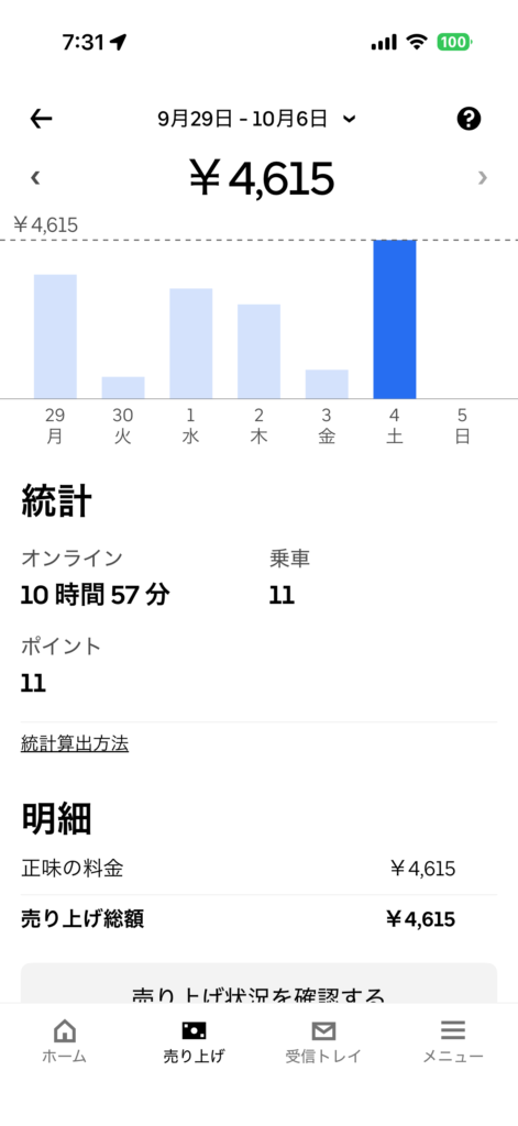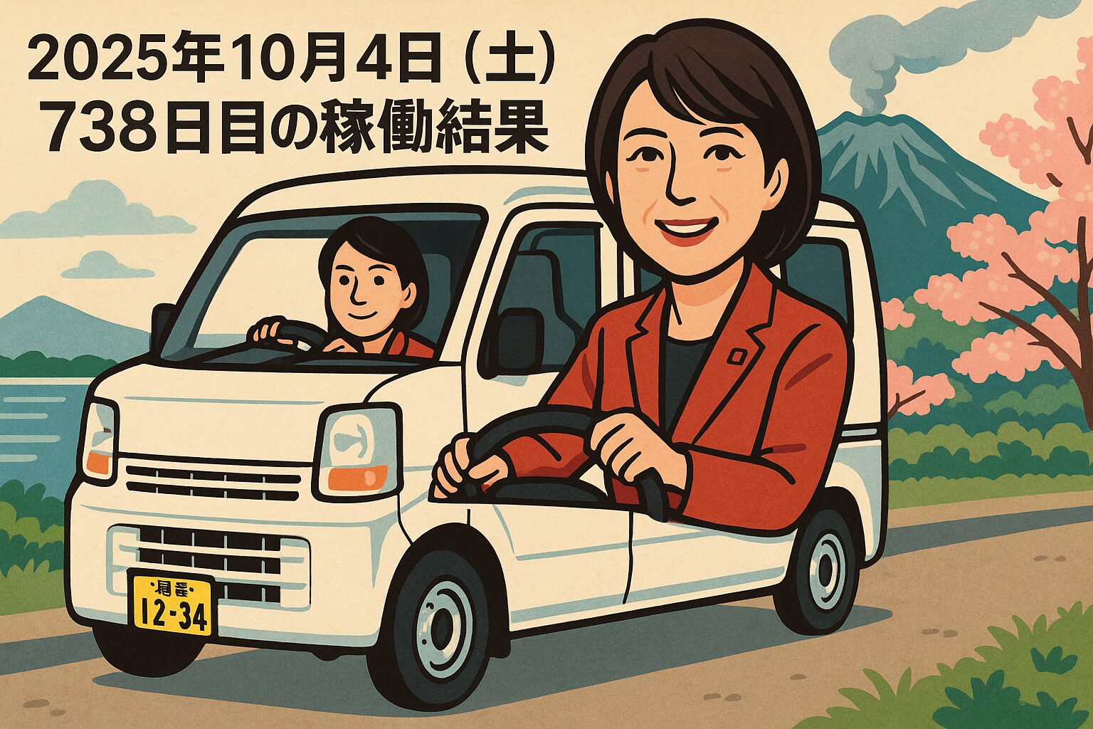 2025年10月4日(土) 738日目、鹿児島ウーバー配達員の稼働結果です。