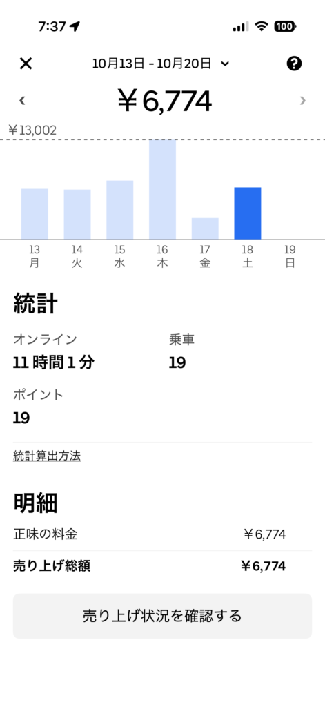 2025年10月18日(土) 752日目、鹿児島ウーバー配達員の稼働結果です。