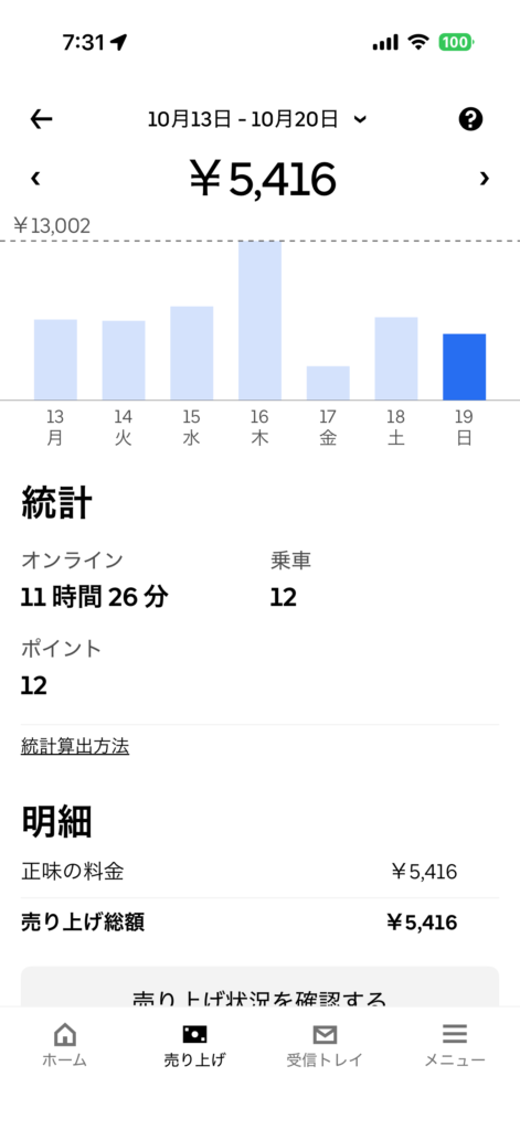 2025年10月19日(日) 753日目、鹿児島ウーバー配達員の稼働結果です。