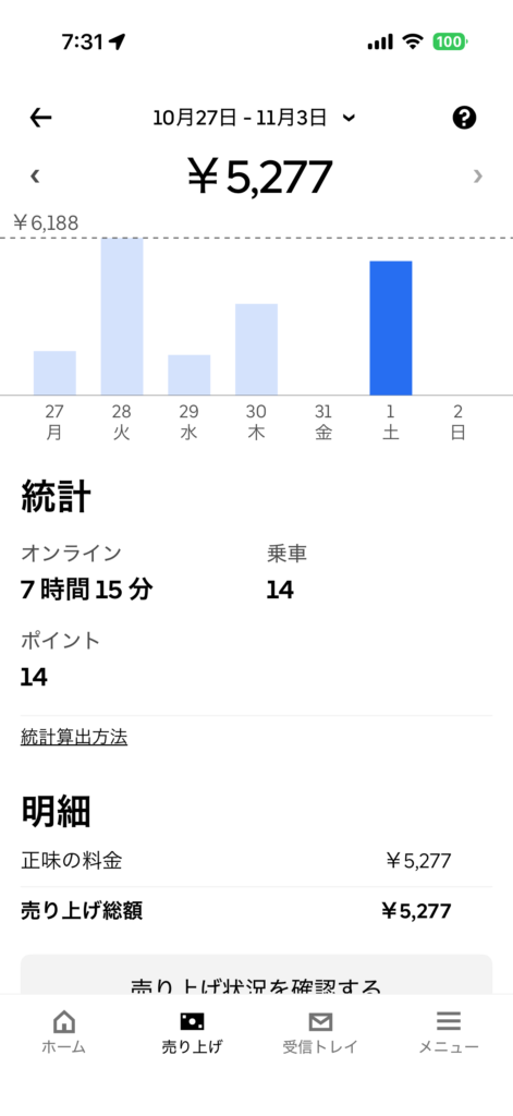 2025年11月1日(土) 766日目、鹿児島ウーバー配達員の稼働結果