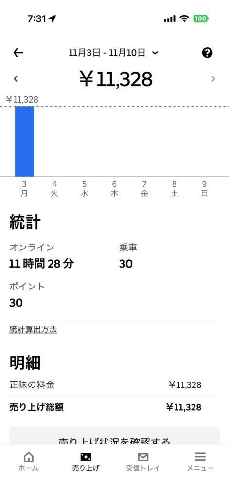 三連休の最終日。日中はおはら祭り。終日、単価は安いがウーバーの鳴り良くメインで回した。PickGoの7NOWの鳴り悪く売上伸びず。