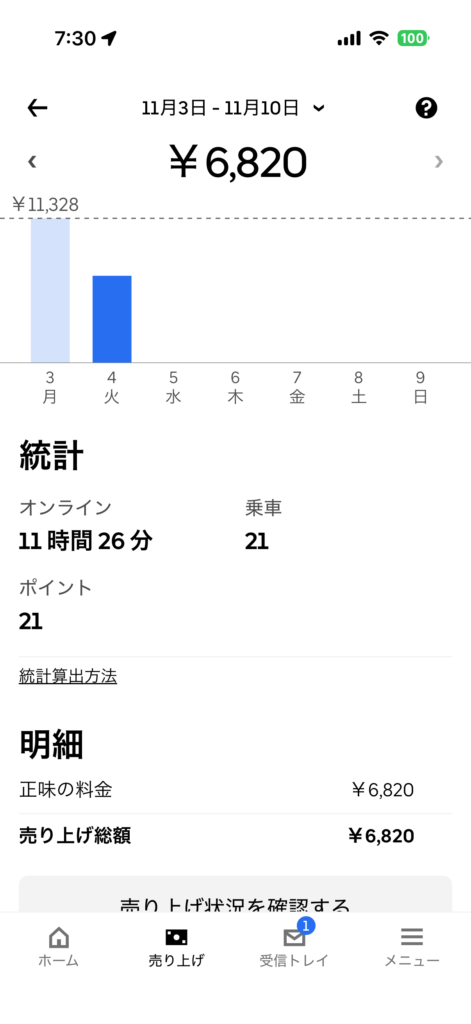 連休明けの平日初日は鳴りが良いことが多いが本日は31件と鳴りは悪く無かったがウーバーの単価が安すぎて売上伸びず。