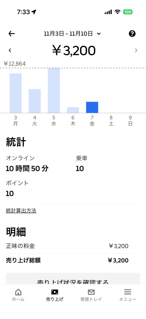2025年11月7日(金) 772日目、鹿児島ウーバー配達員の稼働結果です。