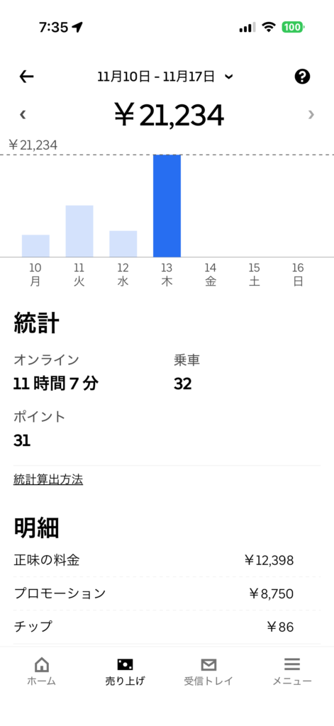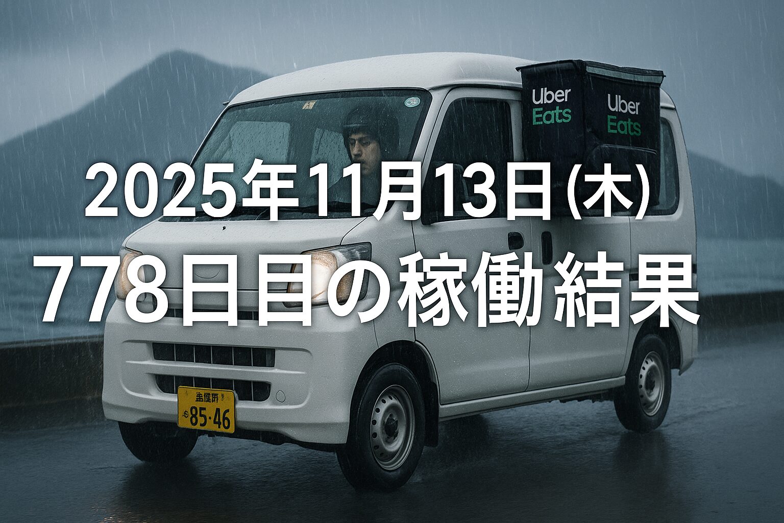2025年11月13日(木) 778日目、鹿児島ウーバー配達員の稼働結果です。