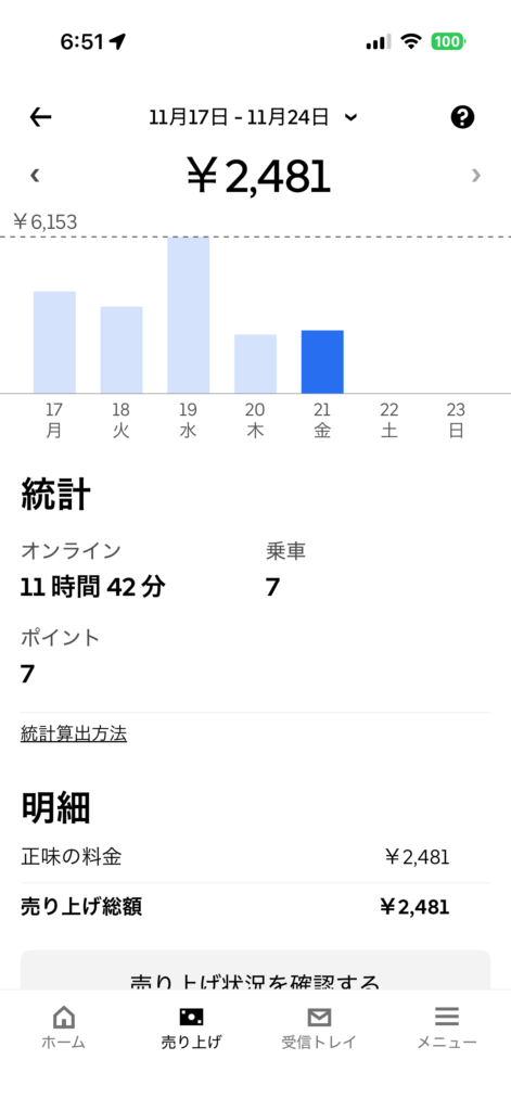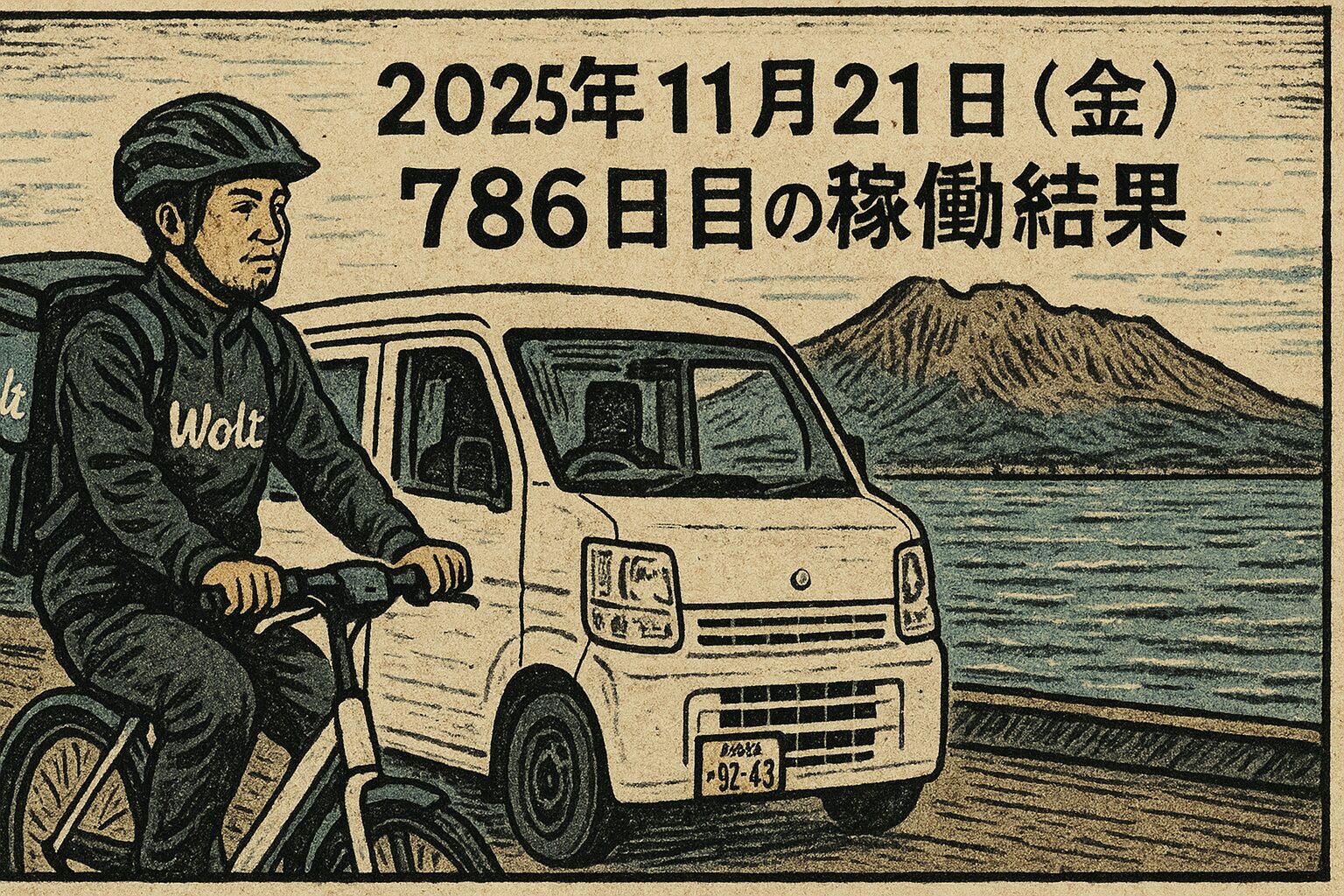 2025年11月21日(金) 786日目、鹿児島ウーバー配達員の稼働結果