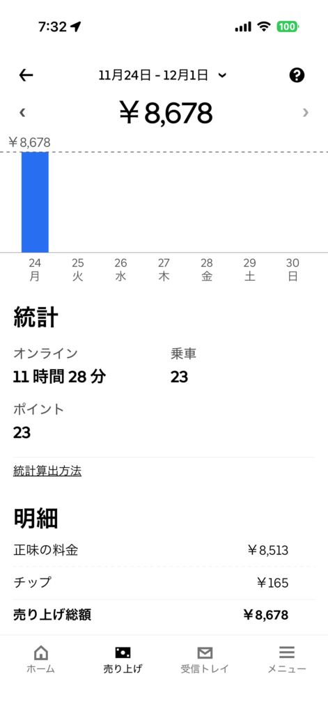 2025年11月24日(月) 789日目、鹿児島ウーバー配達員の稼働結果です。