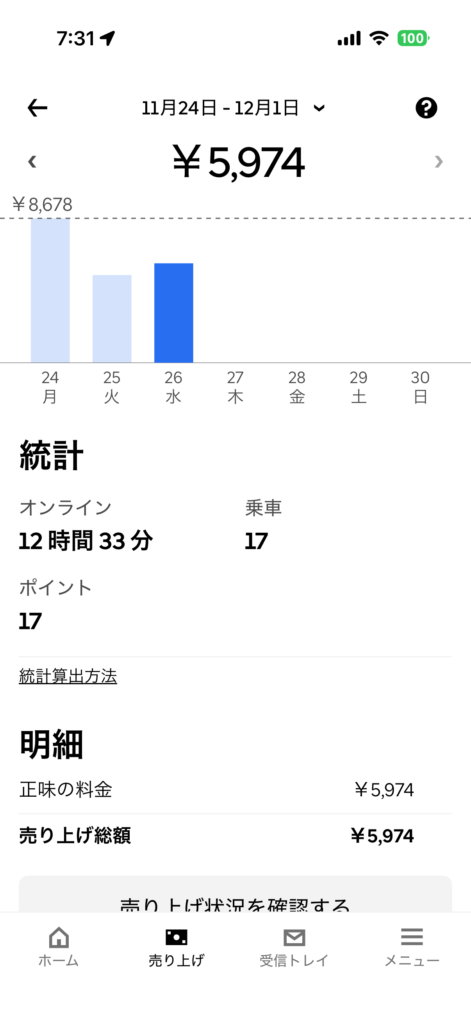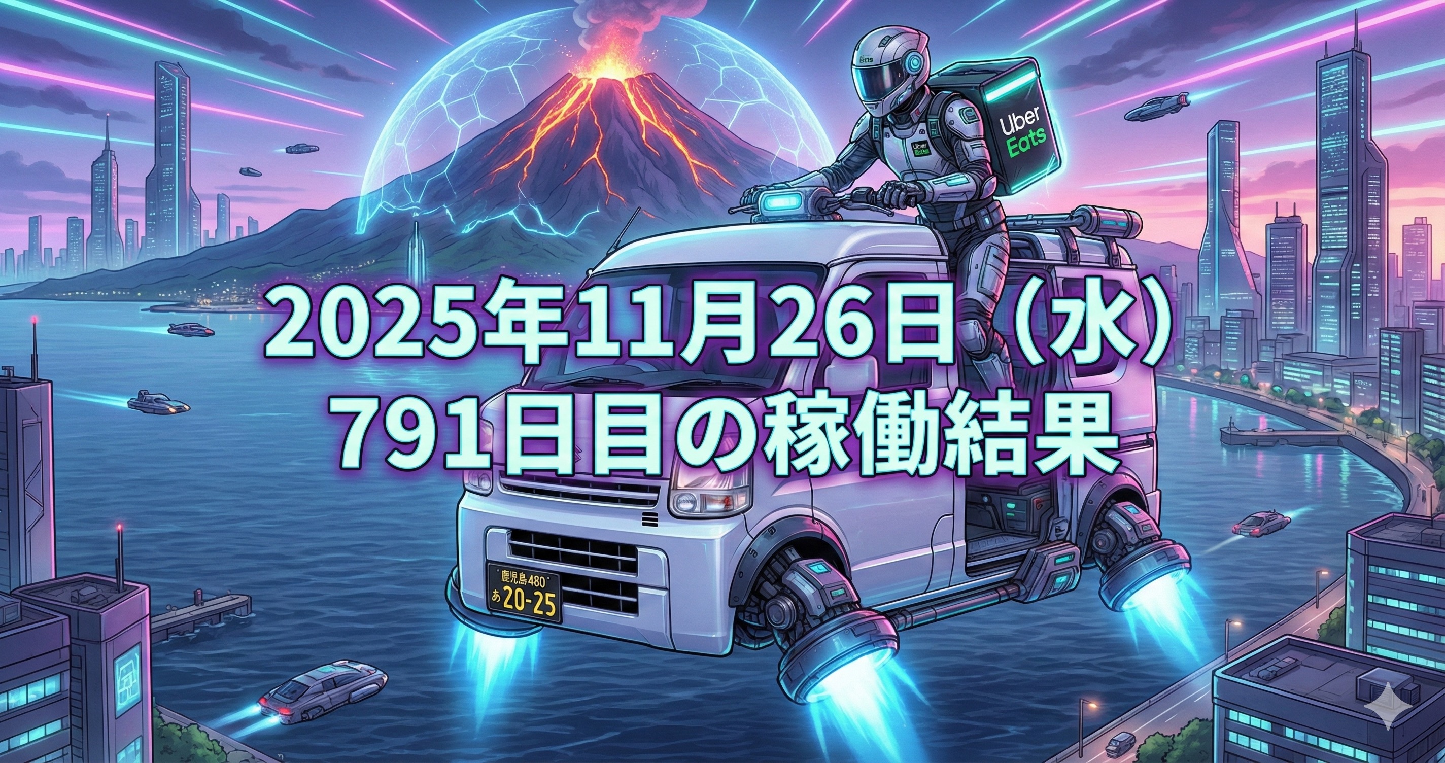 2025年11月26日(水) 791日目、鹿児島ウーバー配達員の稼働結果です。