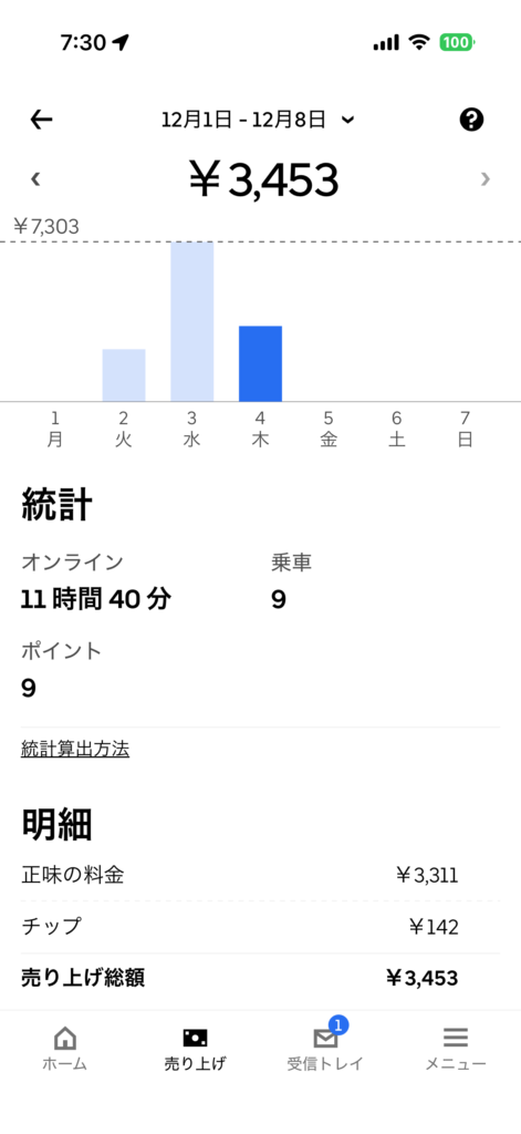 2025年12月4日(木) 799日目、鹿児島ウーバー配達員の稼働結果です。