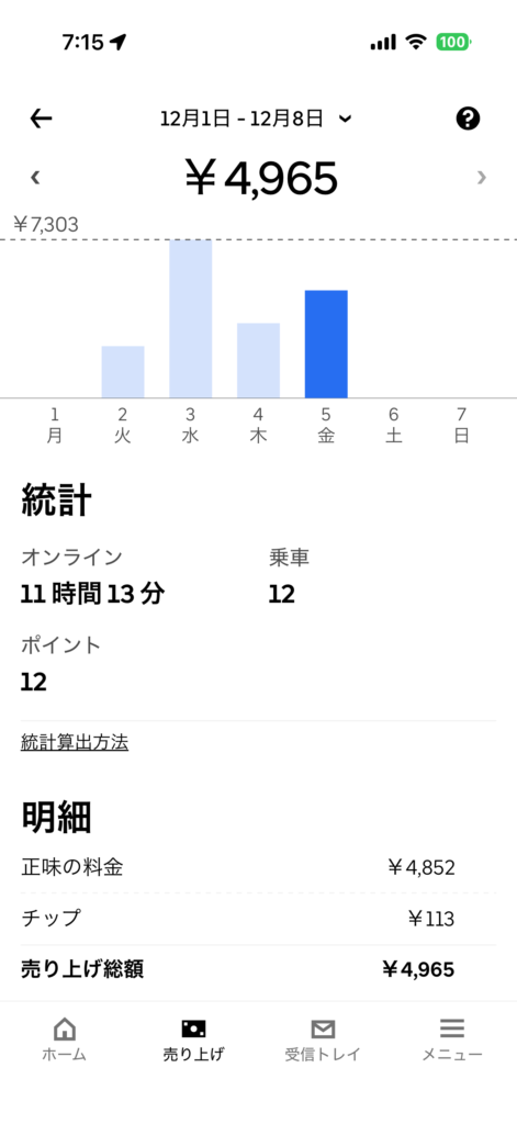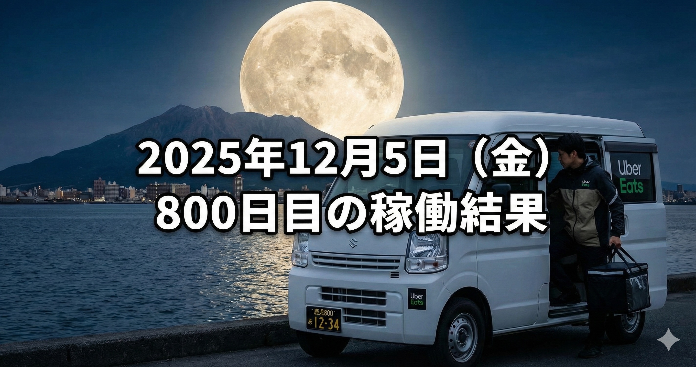 2025年12月5日(金) 800日目、鹿児島ウーバー配達員の稼働結果です。