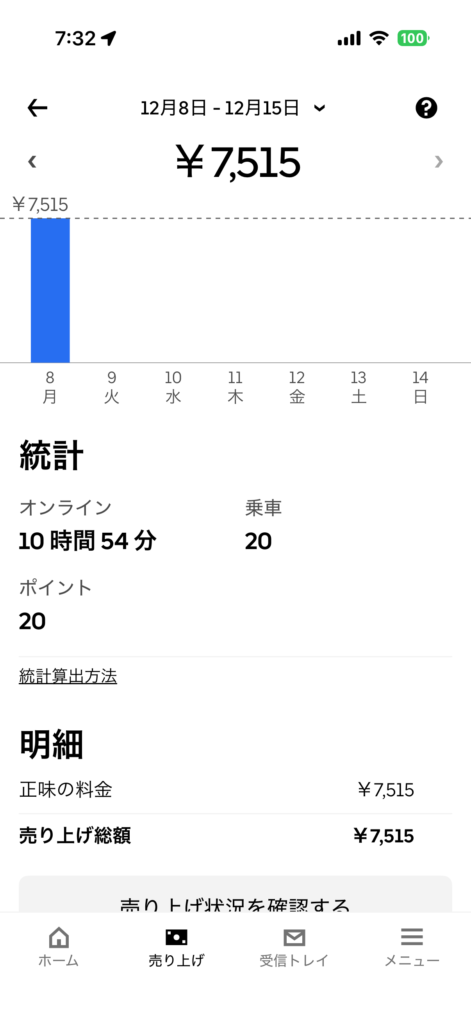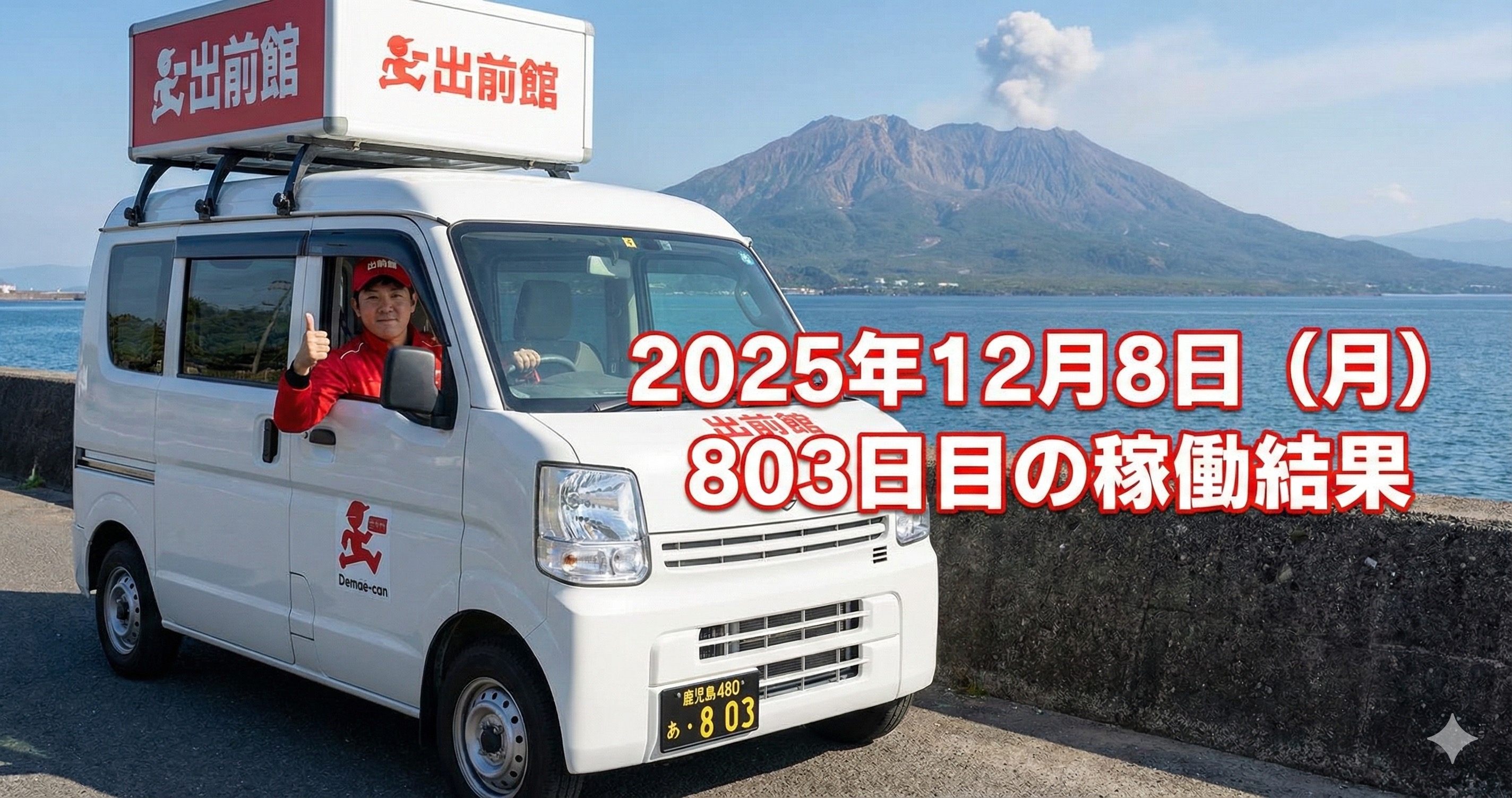 2025年12月8日(月) 803日目、鹿児島ウーバー配達員の稼働結果です。
