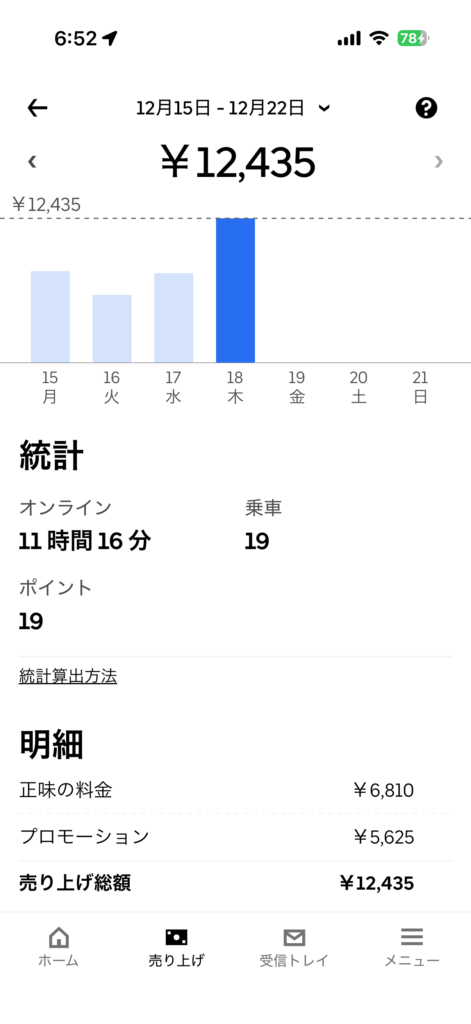 2025年12月18日(木) 813日目、鹿児島ウーバー配達員の稼働結果です。