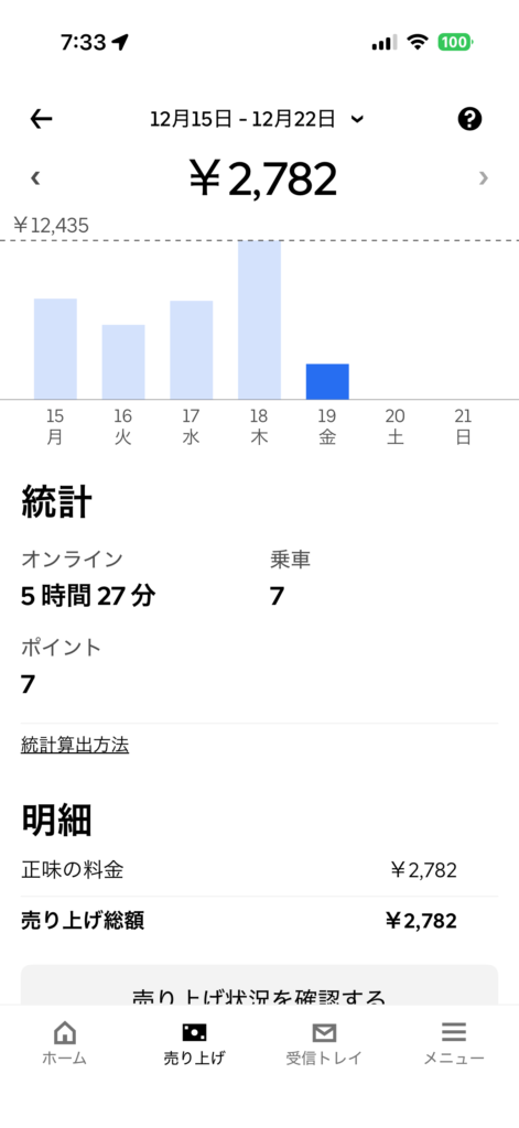 2025年12月19日(金) 814日目、鹿児島ウーバー配達員の稼働結果です。