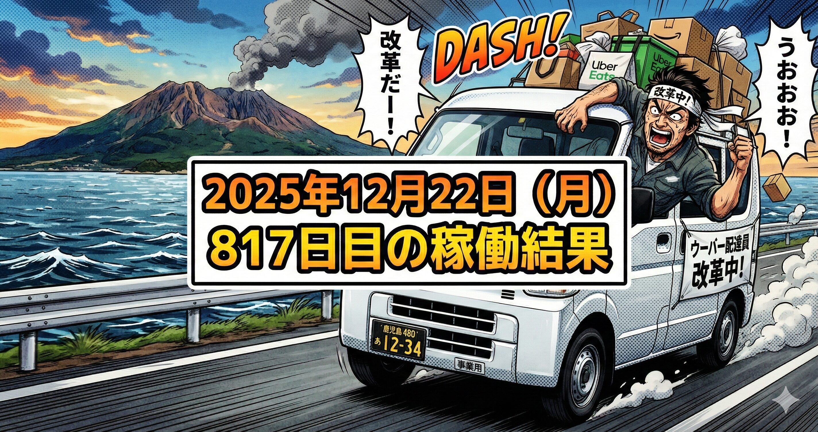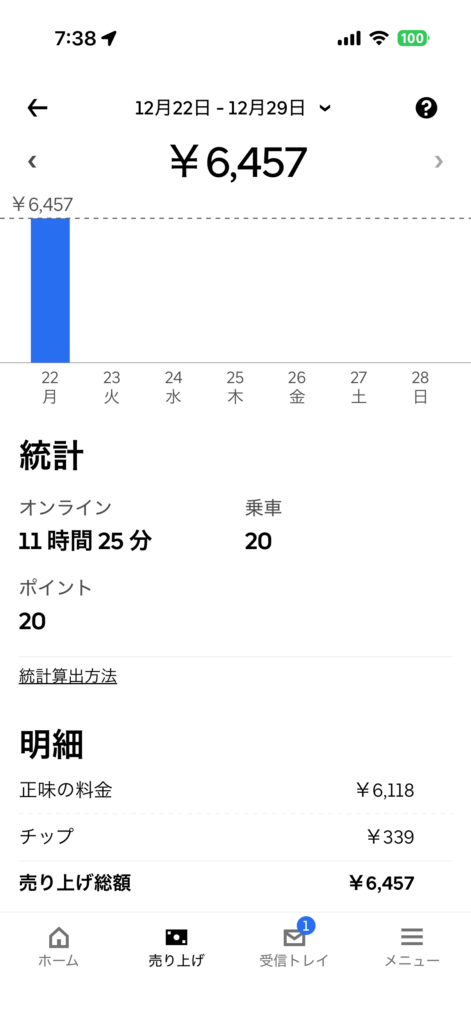 2025年12月22日(月) 817日目、鹿児島ウーバー配達員の稼働結果です。