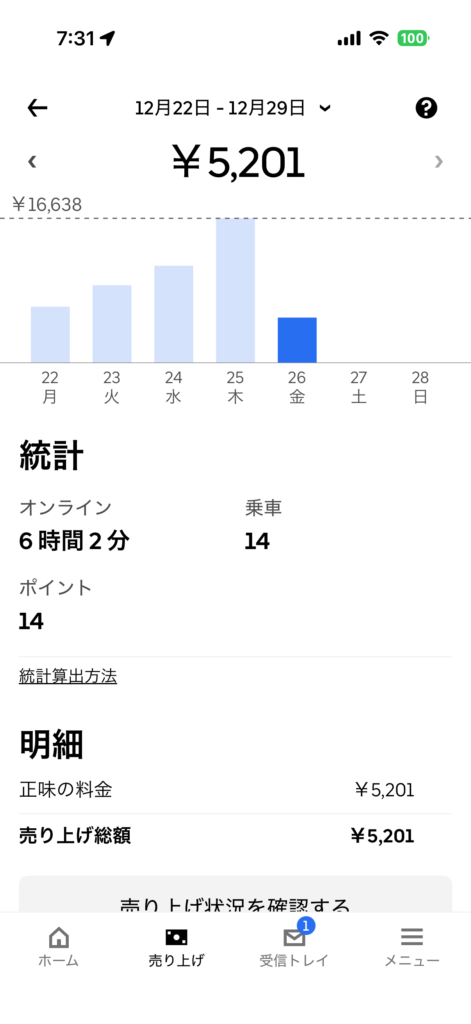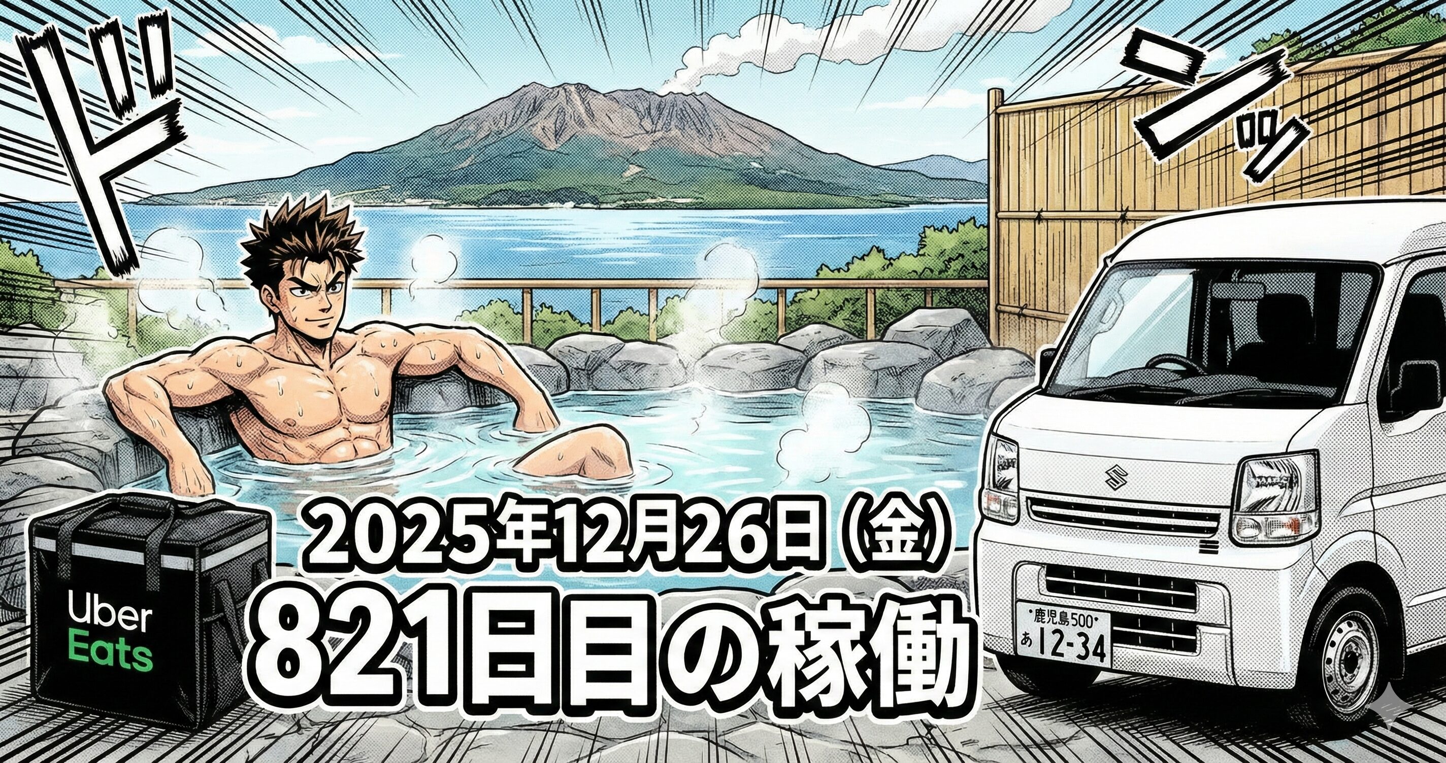 2025年12月26日(金) 821日目、鹿児島ウーバー配達員の稼働結果です。