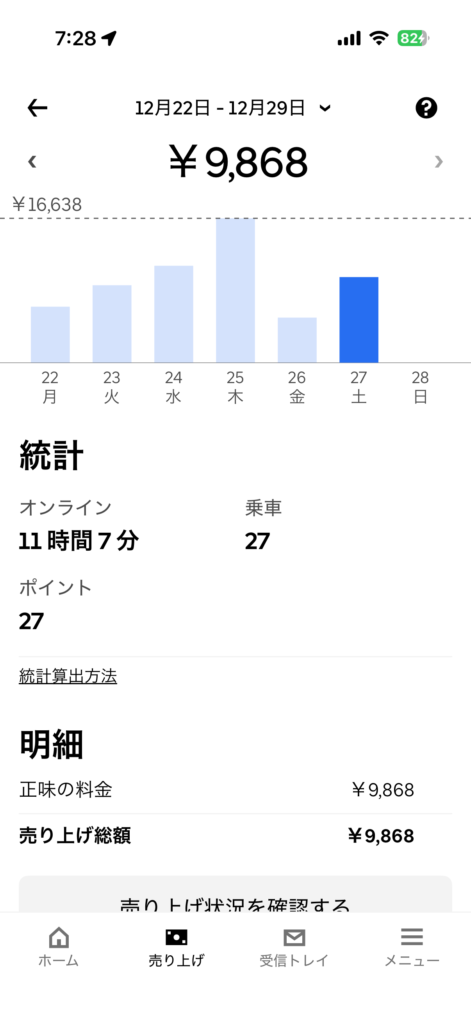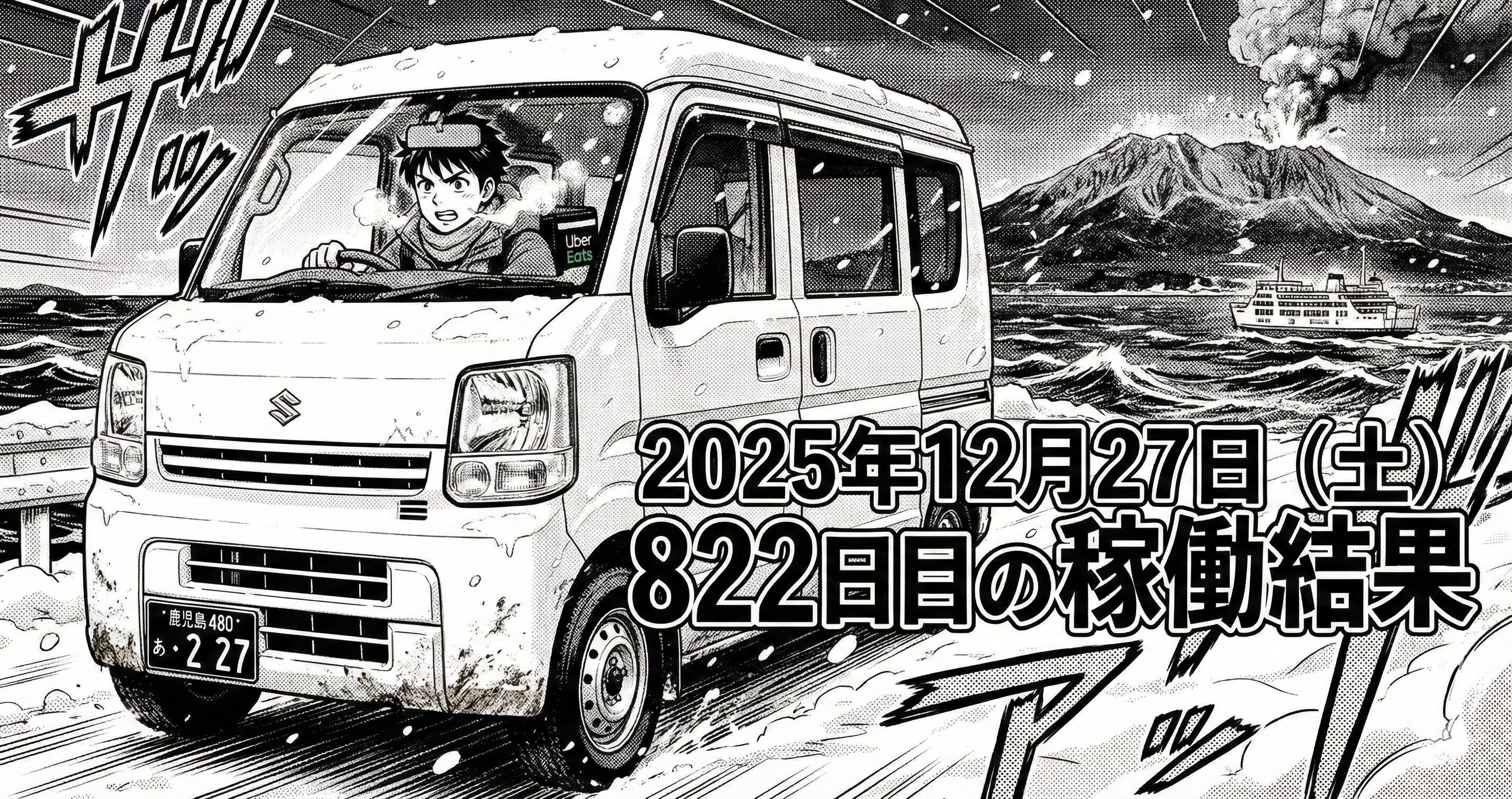2025年12月27日(土) 822日目、鹿児島ウーバー配達員の稼働結果です。
