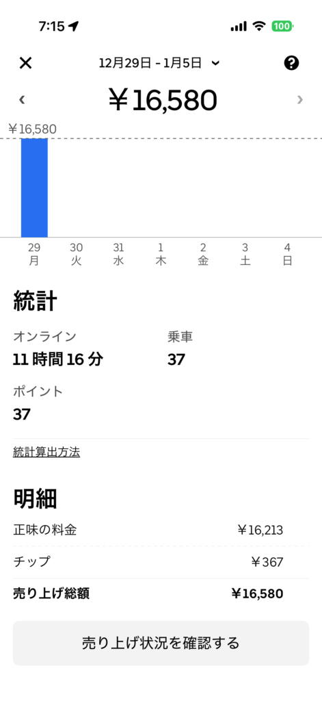 さすが年末だけあって特に終日ウーバーの鳴り良く、ウーバーメインで回した。繁忙期に突入で嬉しい。