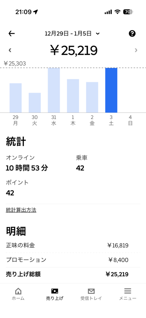 正月3日目。30分ほど早めに上がった。終日ウーバーの鳴り良く夜は単価が良き時間帯もあった。週末クエ1〜2段目8,400円クリア。