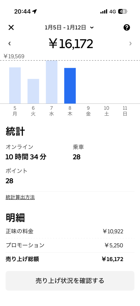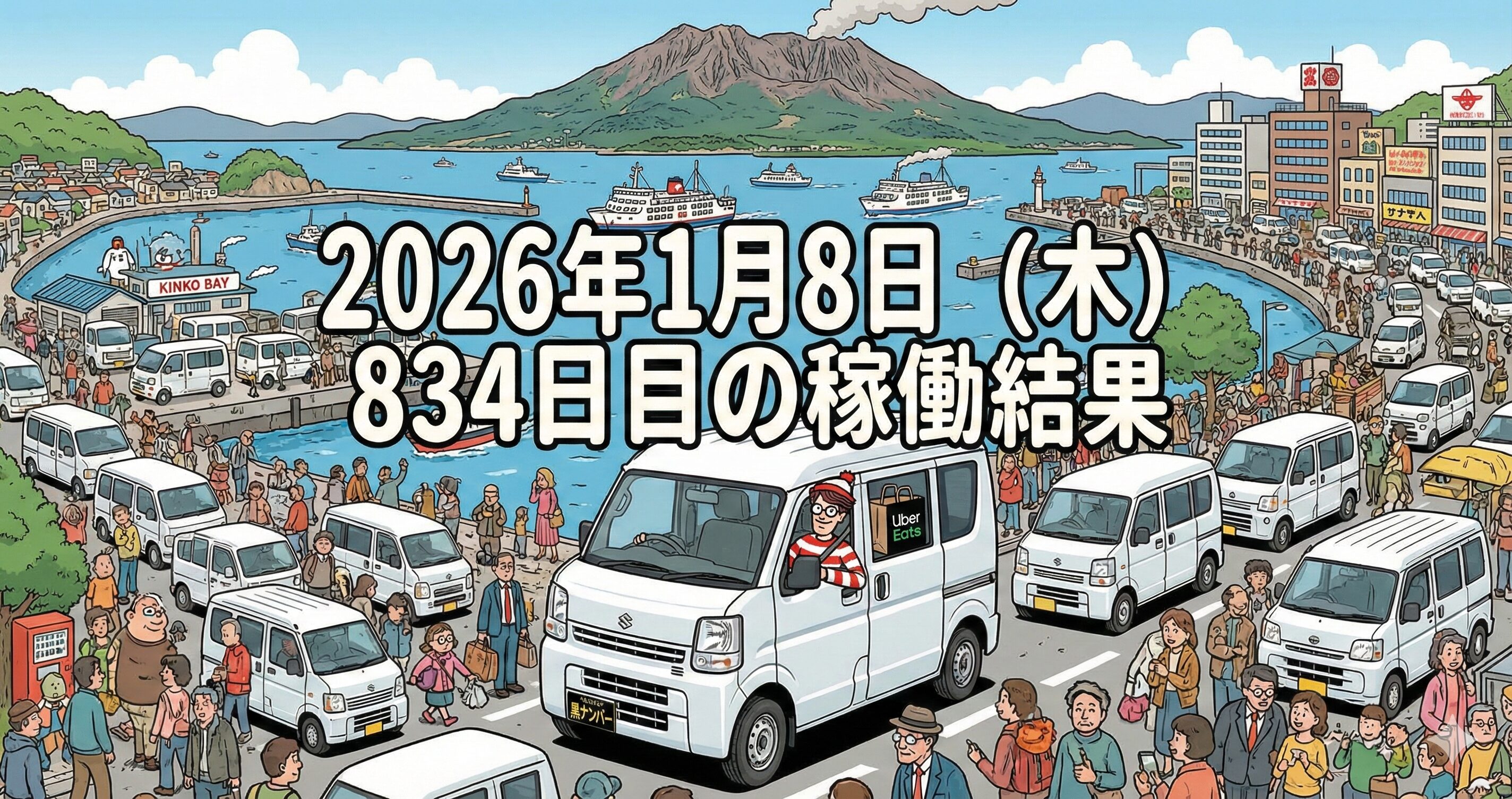 2026年1月8日(木) 834日目、鹿児島ウーバー配達員の稼働結果です。