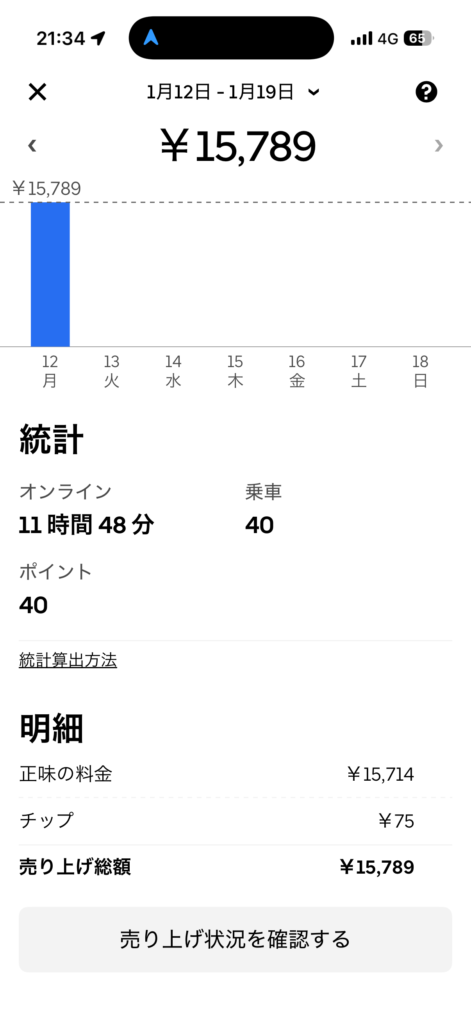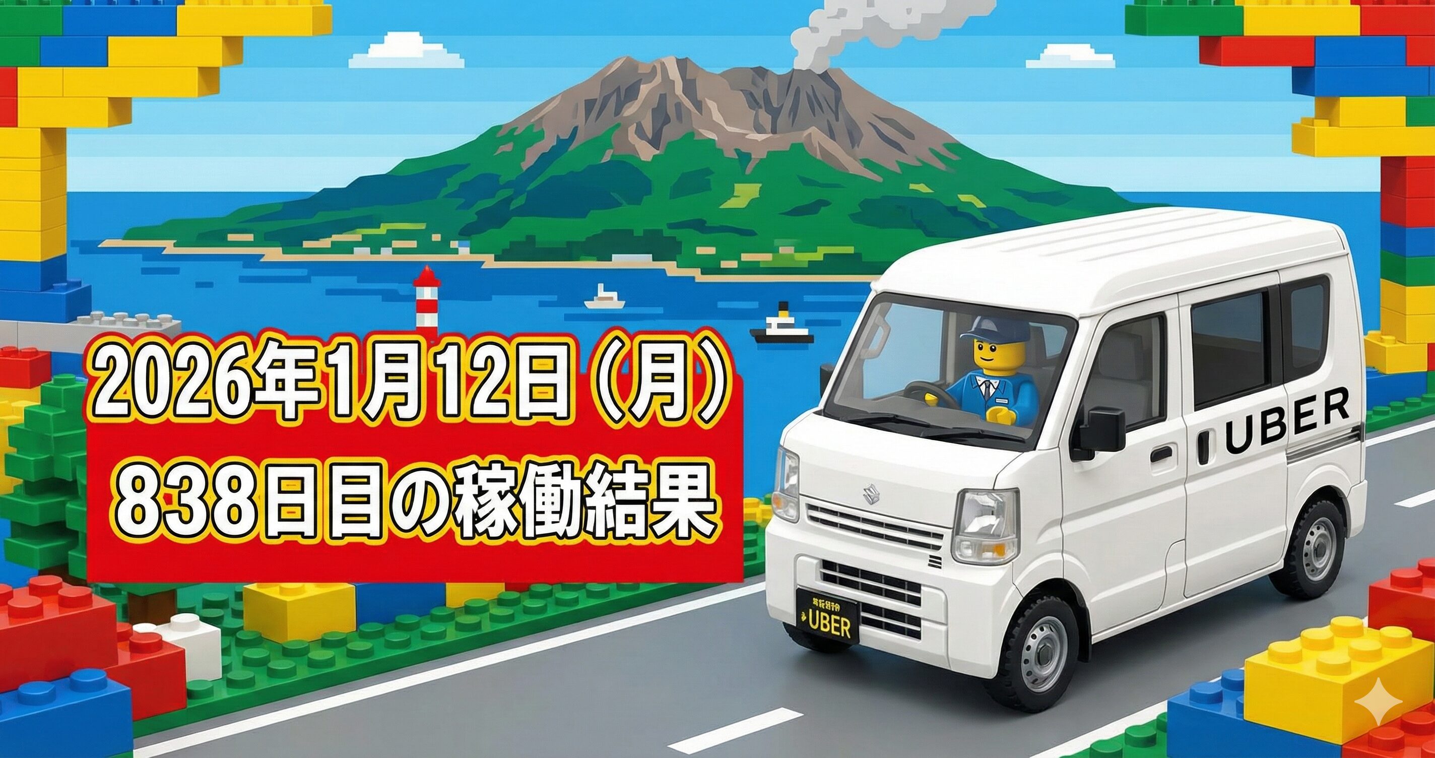 2026年1月12日(月) 838日目、鹿児島ウーバー配達員の稼働結果です。