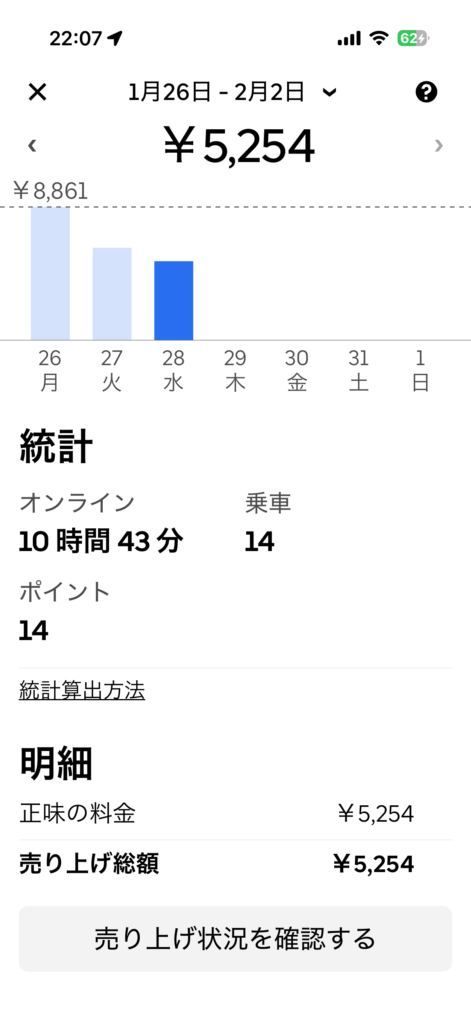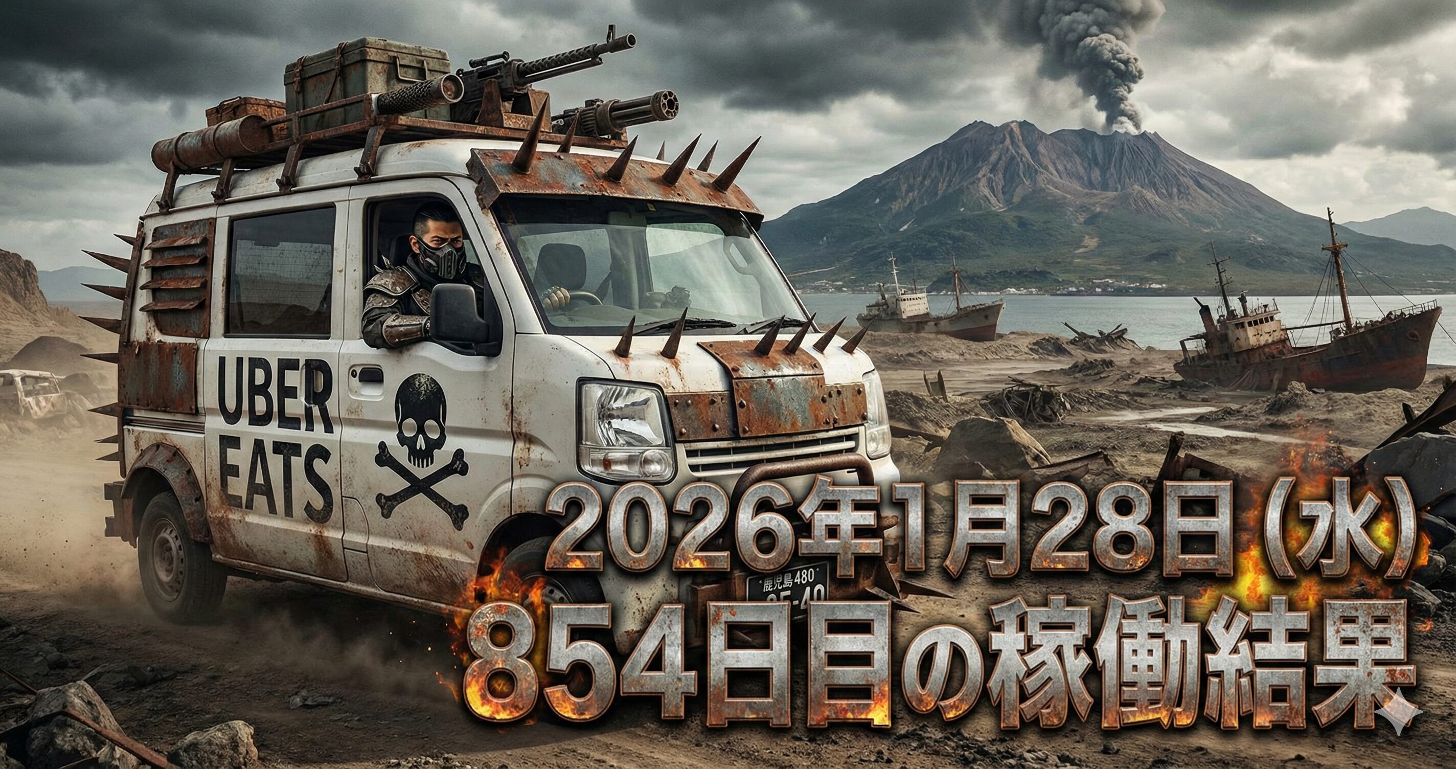 2026年1月28日(水) 854日目、鹿児島ウーバー配達員の稼働結果です。