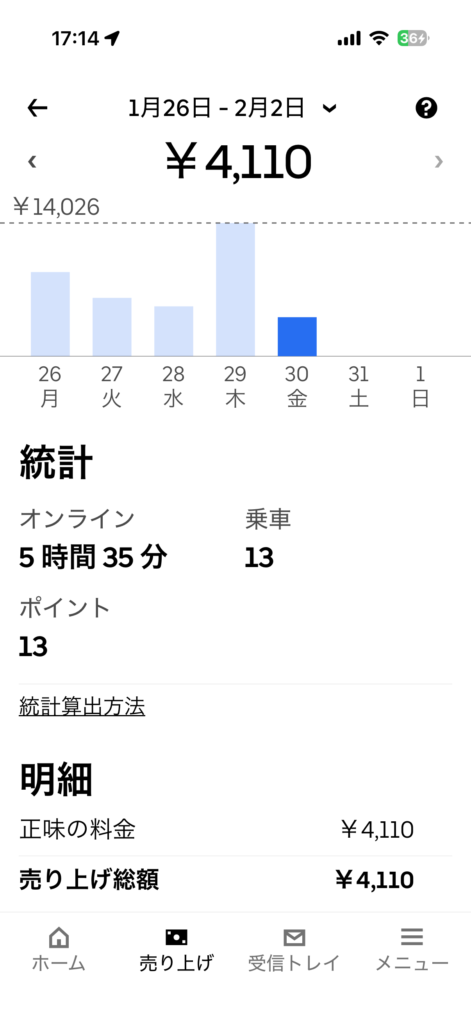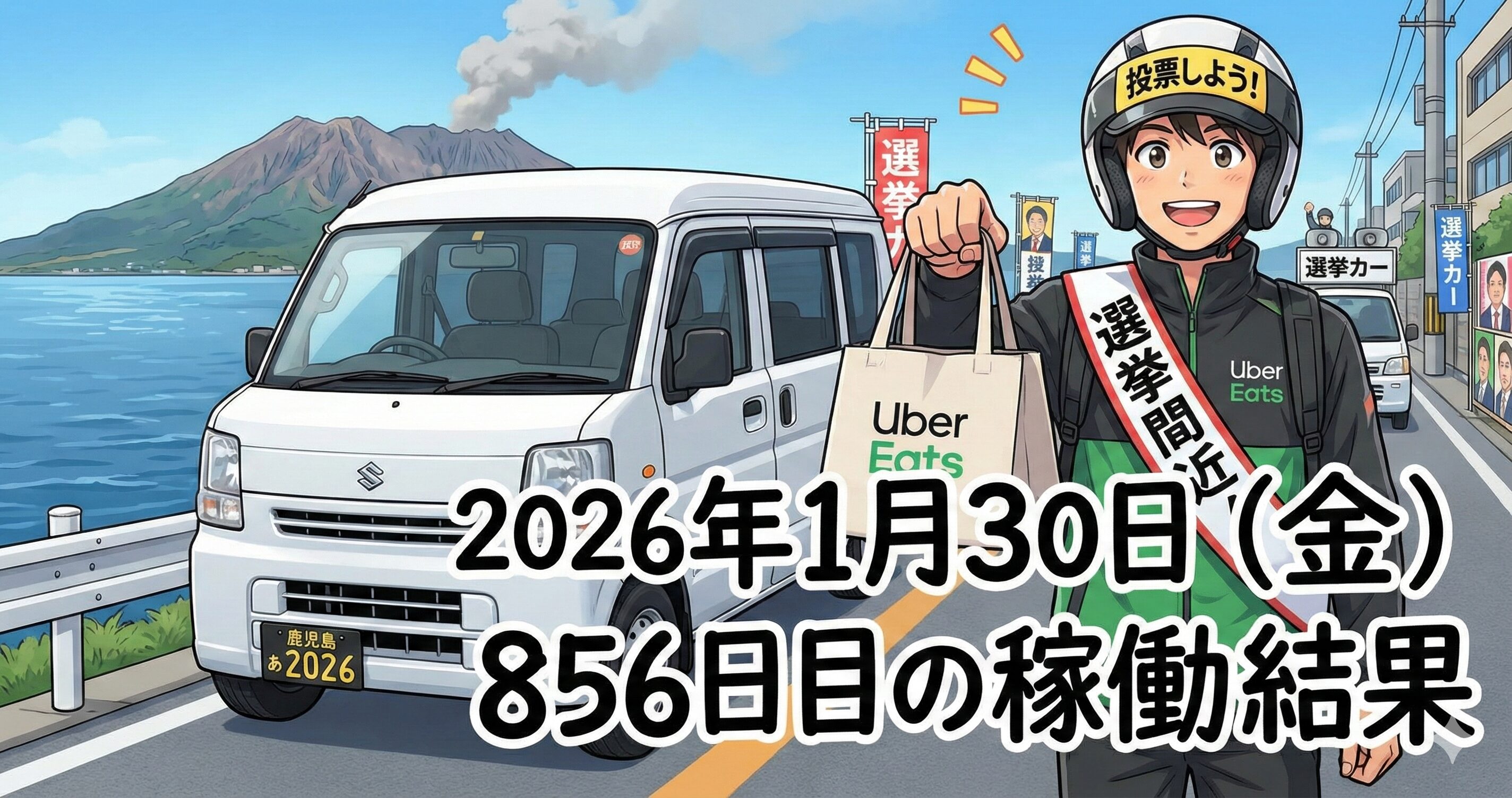 2026年1月30日(金) 856日目、鹿児島ウーバー配達員の稼働結果です。