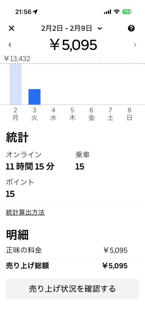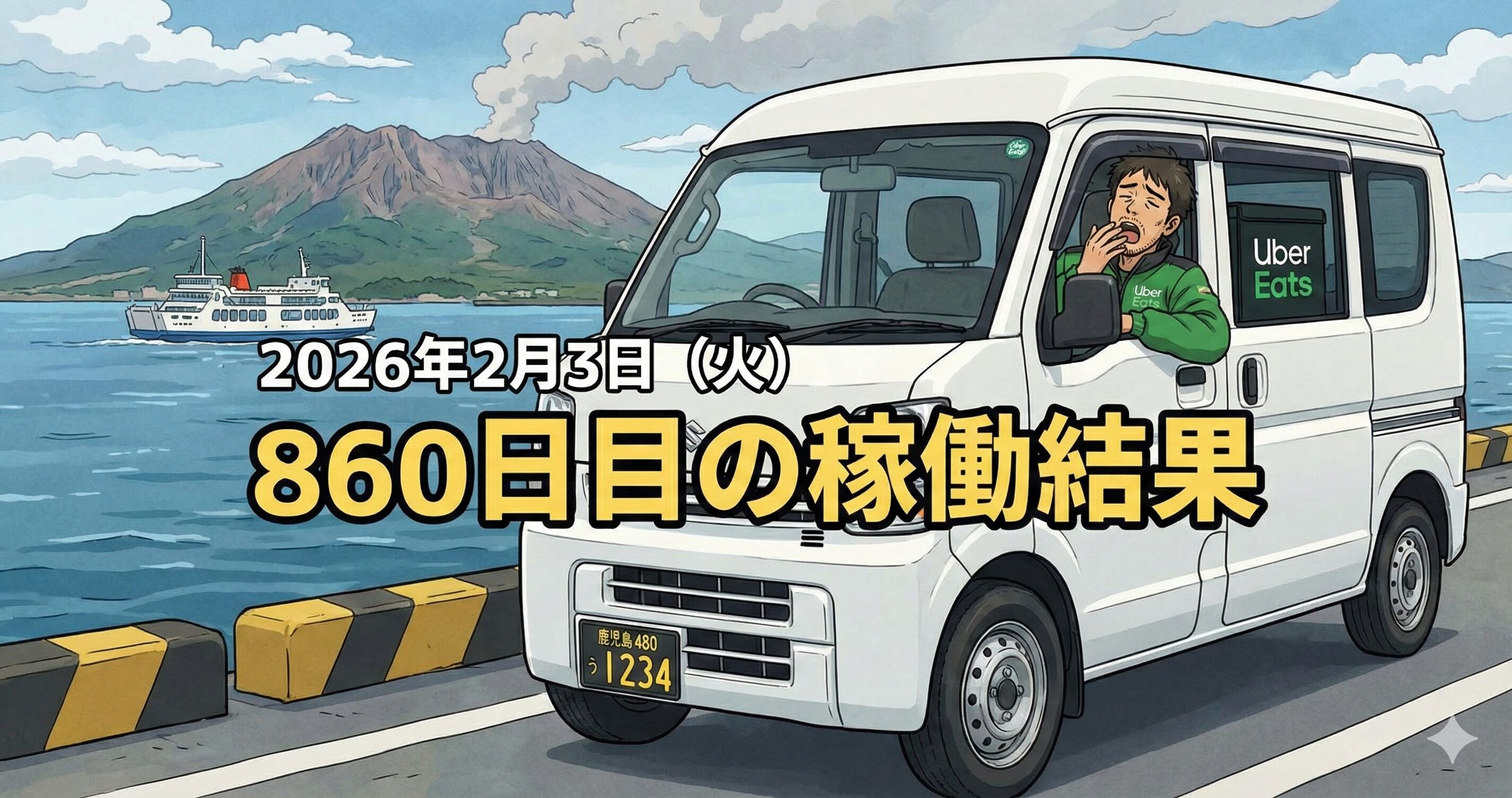2026年2月3日(火) 860日目、鹿児島ウーバー配達員の稼働結果です。