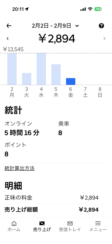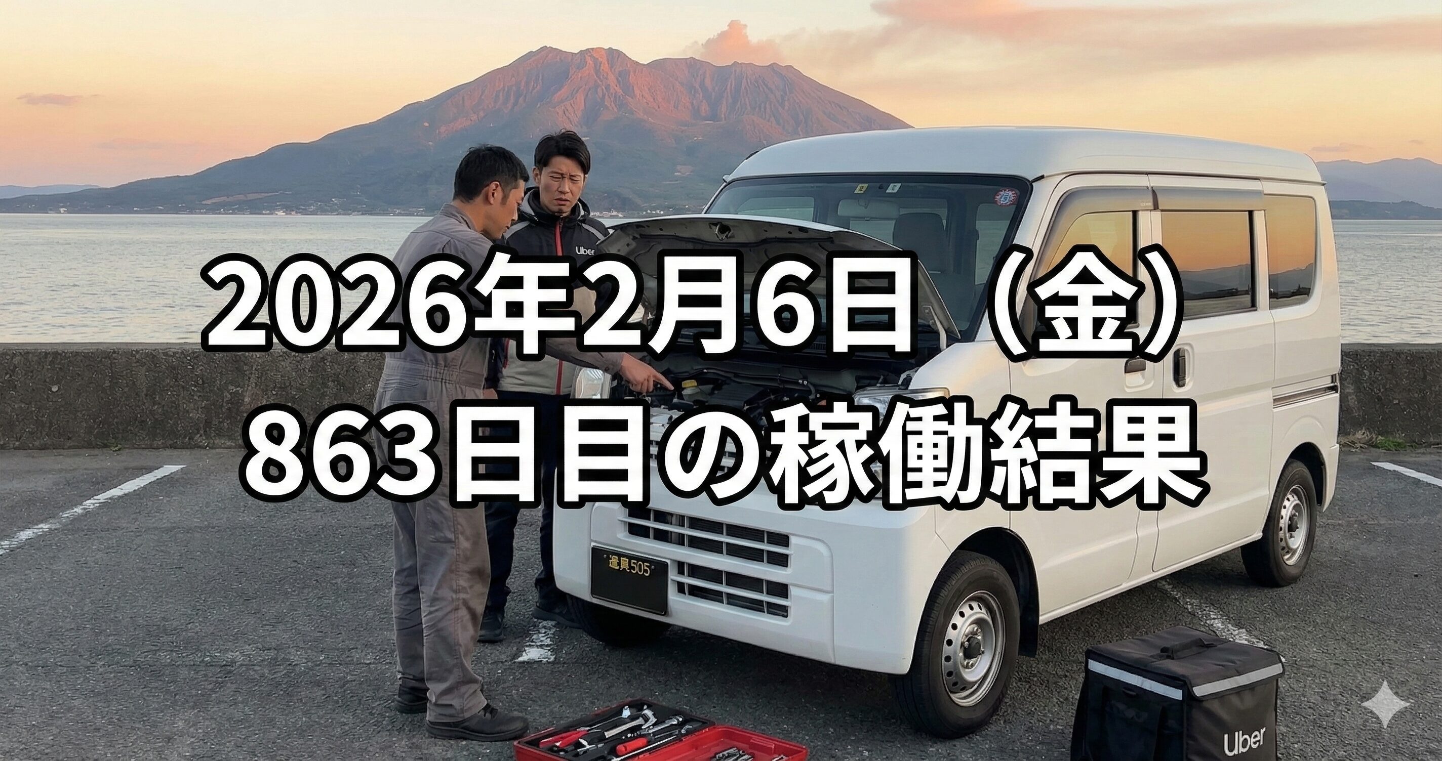 2026年2月6日(金) 863日目、鹿児島ウーバー配達員の稼働結果です。