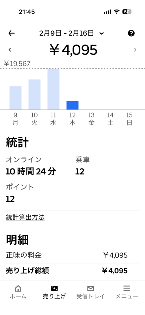 2026年2月12日(木) 869日目、ウーバー配達員の稼働結果です。