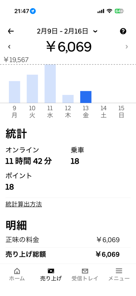 ウーバー 18件 6,069円