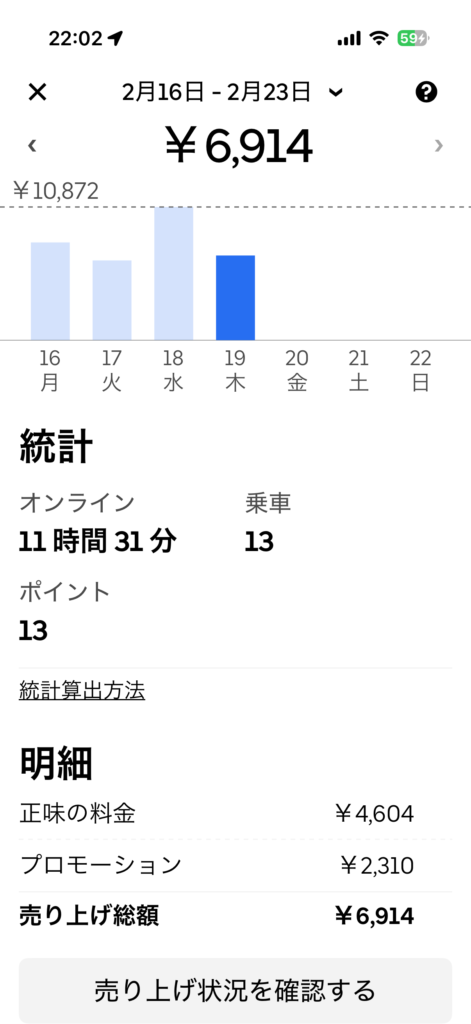 2026年2月19日(木) 876日目、鹿児島ウーバー配達員の稼働結果です。