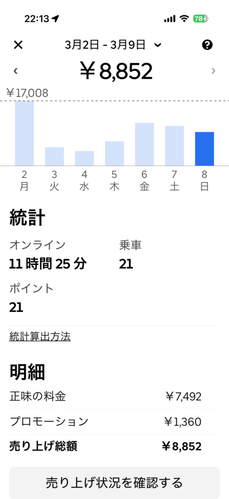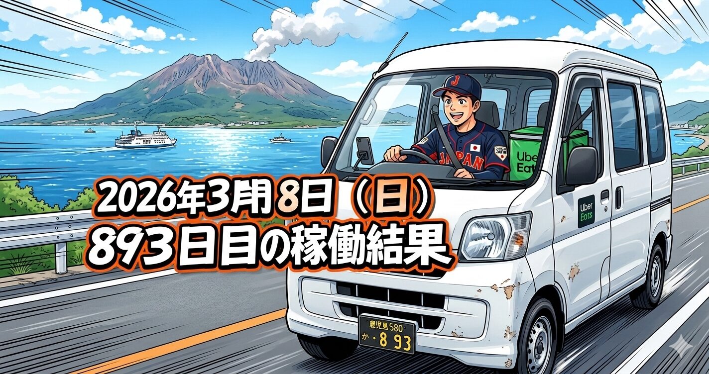 2026年3月8日(日) 893日目、鹿児島ウーバー配達員の稼働結果です。