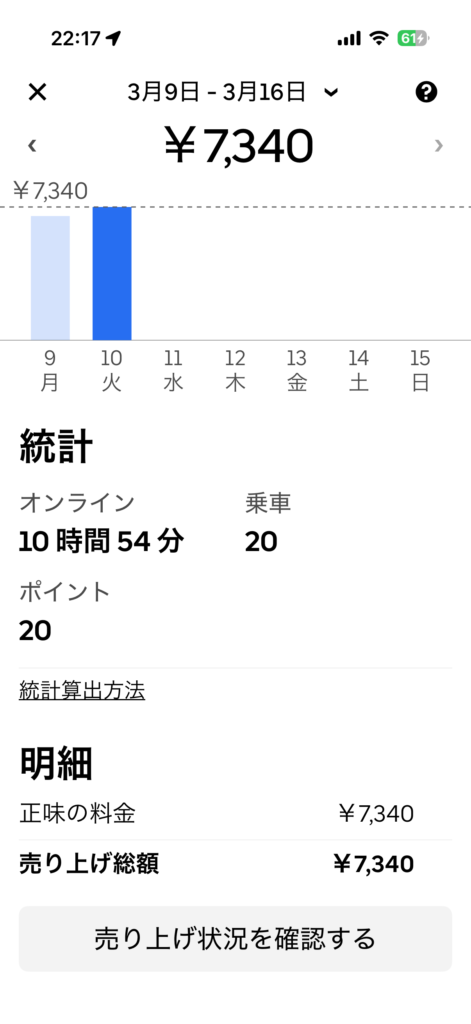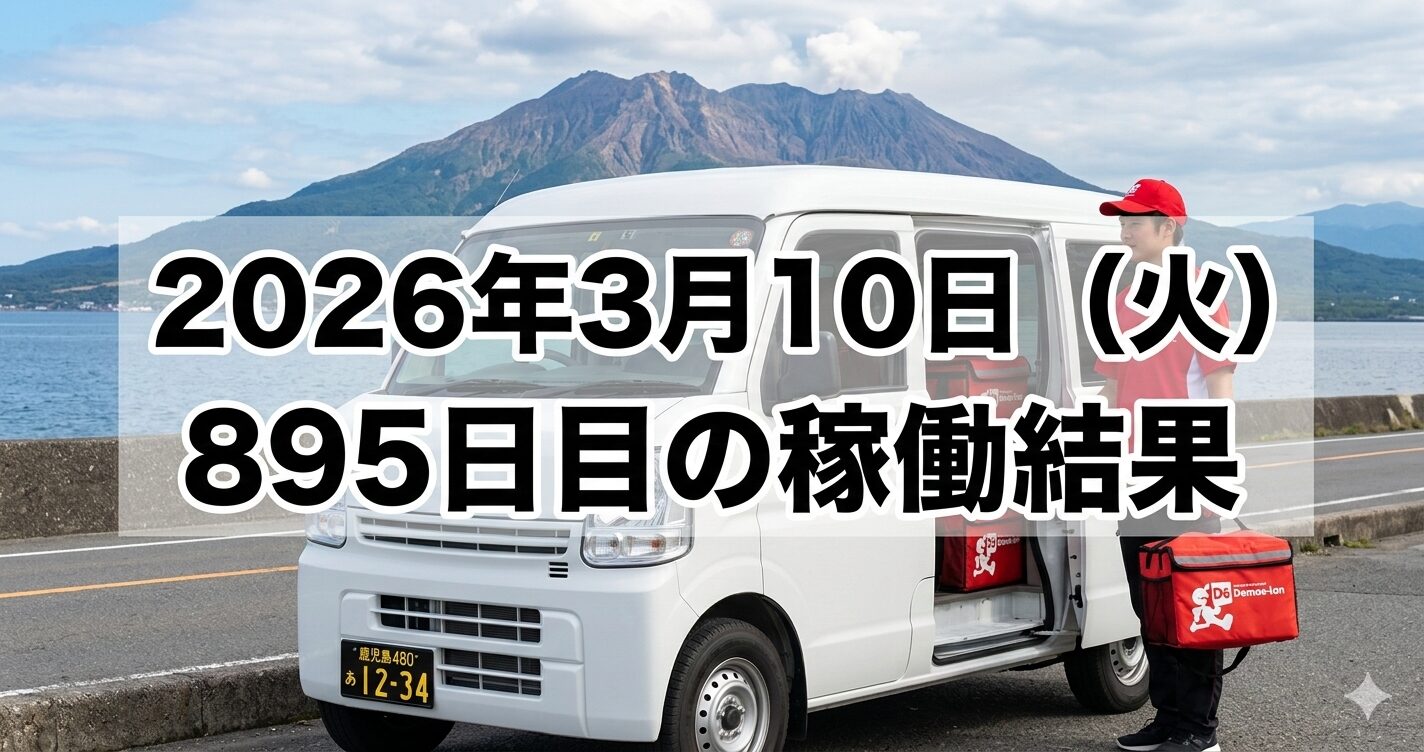 2026年3月10日(火) 895日目、鹿児島ウーバー配達員の稼働結果です。