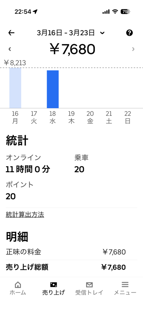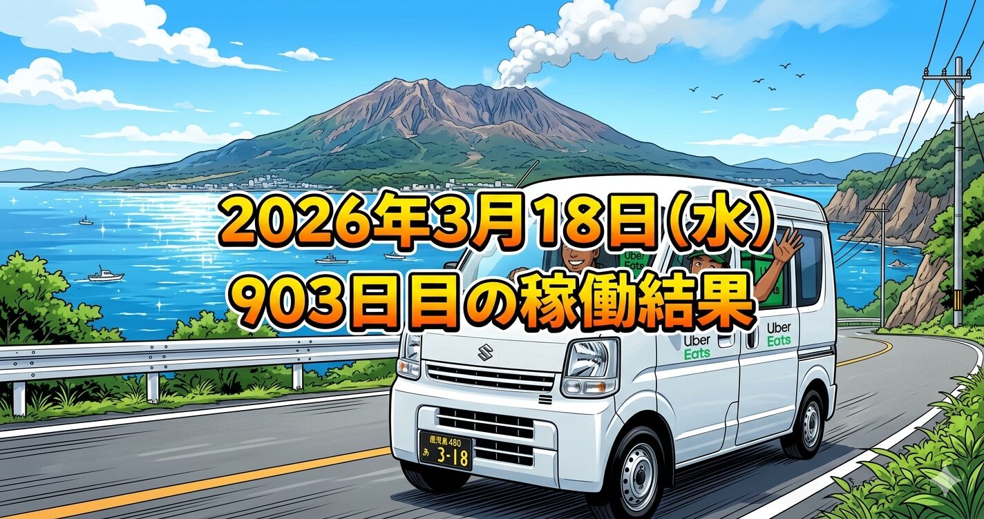 2026年3月18日(水) 903日目、鹿児島ウーバー配達員の稼働結果です。