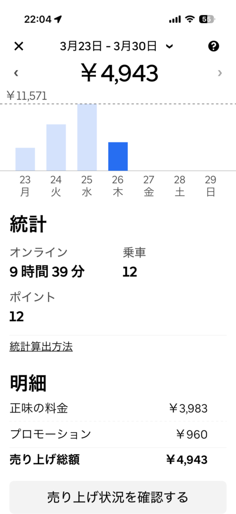 2026年3月26日(木) 911日目、鹿児島ウーバー配達員の稼働結果です。