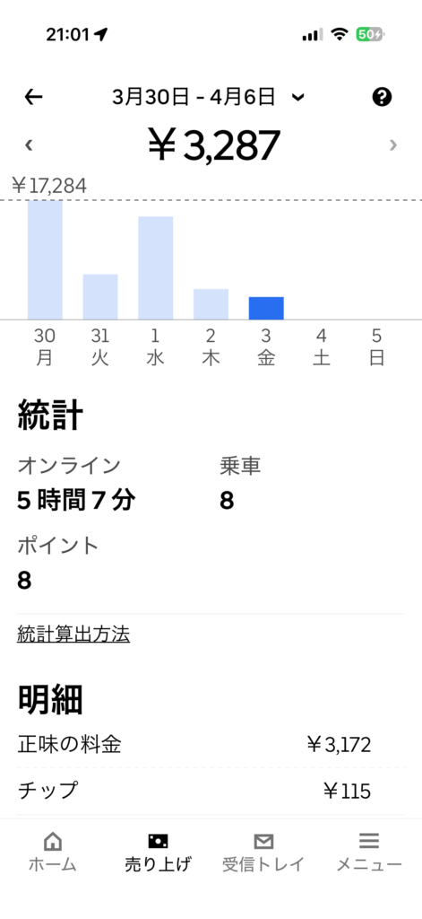 2026年4月3日(金) 919日目、鹿児島ウーバー配達員の稼働結果