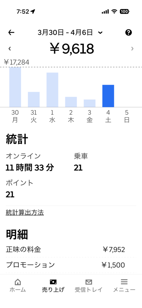 2026年4月4日(土) 920日目、鹿児島ウーバー配達員の稼働結果